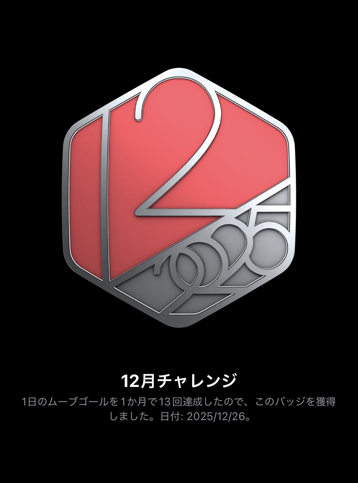 スポンサーリンク 2025年12月チャレンジ 日記Screenshot X Mastodon Bluesky Facebook はてブ LINE コピー 2025.12.26 今月のチャレンジは,ムーブゴールを13回達成するというもの。 そんなに苦労せず完成。 Screenshot メデタシメデタシ。